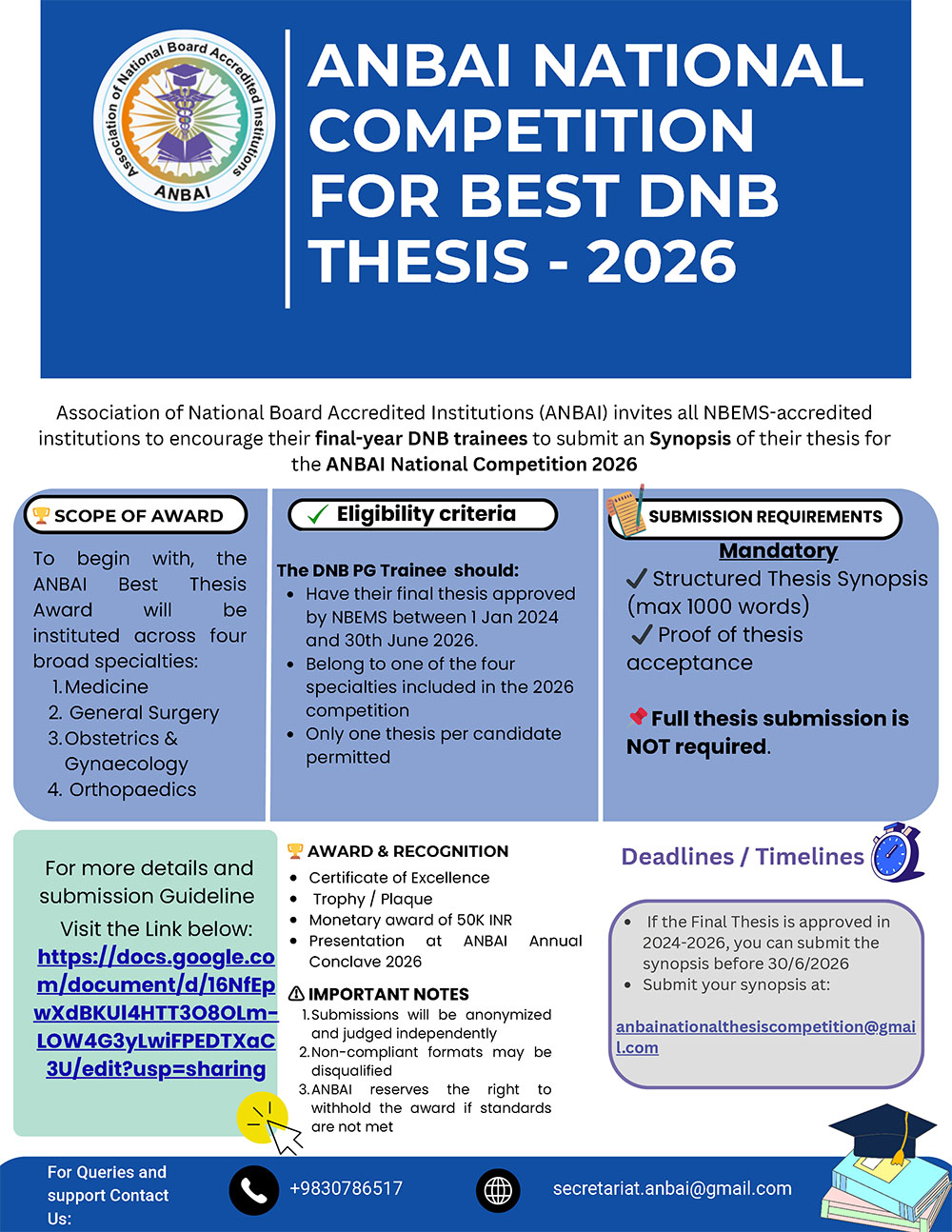 Association of National Board Accredited Institutions (ANBAI) invites all NBEMS-accredited institutions to encourage their final-year DNB trainees to submit an Synopsis of their thesis for the ANBAI National Competition 2026